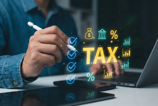 Businessman using digital interface for tax planning and filing with icons of checklist, percentage, and finance. Concept for online tax filing, accounting, fintech, and digital tax solution.
