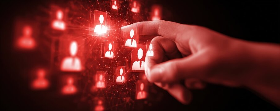 A hand selects a user icon from a glowing red network of interconnected digital profiles.