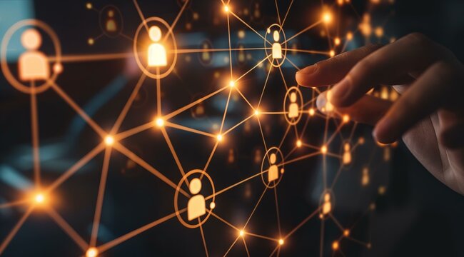 Connecting to the Network: A hand interacts with a digital interface showcasing interconnected profile icons, suggesting concepts like networking, data connections, social engagement.