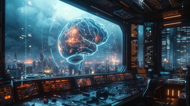 A cutting-edge laboratory features a glowing brain hologram, showcasing advanced research amidst a stunning urban skyline at dusk.