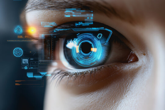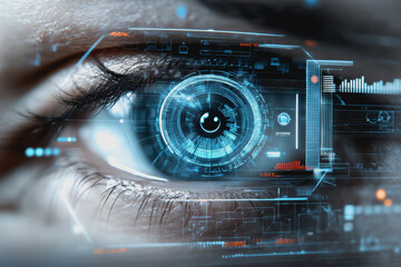 Eye interacting with futuristic HUD display, biometric data, and digital interface elements