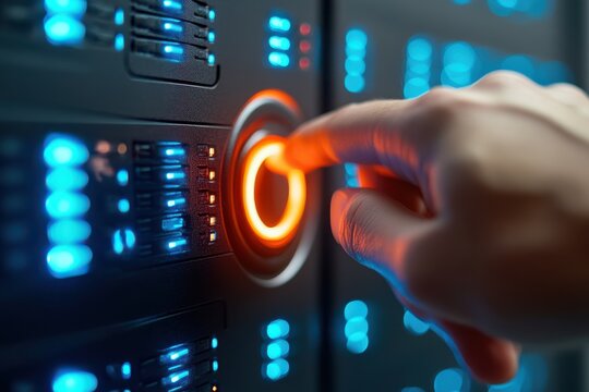 Cloud storage concept with digital upload and download icons over smartphone and laptop on dark background representing online data synchronization.