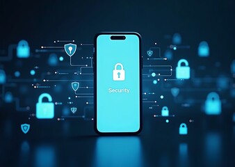 Smartphone displaying security icons with blue background design
