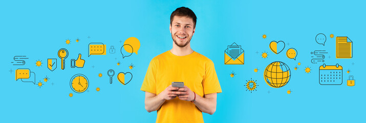 Man Using Smartphone Over Blue Background With Diverse User Interface Icons, Collage