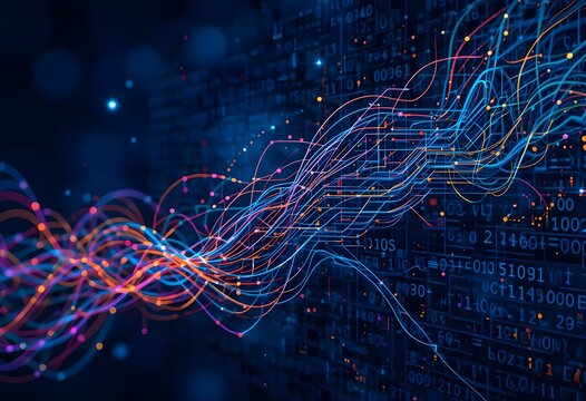 Vibrant multicolored lines weave dynamically over a dark background filled with binary code, evoking themes of data flow and digital connectivity
