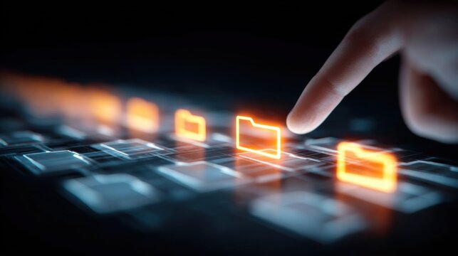 Digital Data Navigation: A hand gracefully interacts with glowing folder icons on a cutting-edge digital interface, symbolizing seamless access and control over vital digital information.