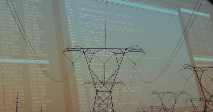 Showcasing high-voltage tower silhouette in rural field at dusk, with power lines and code overlay