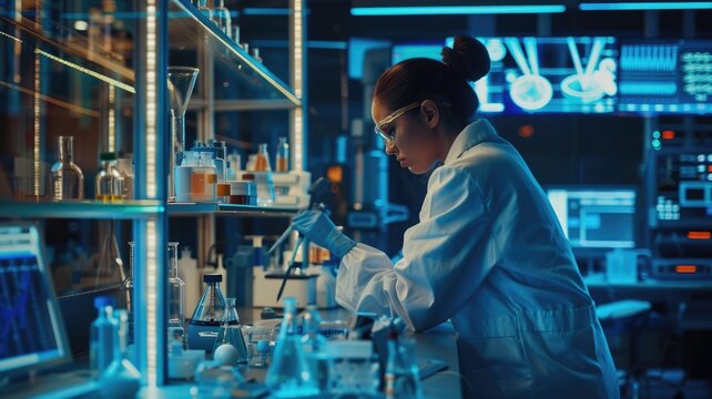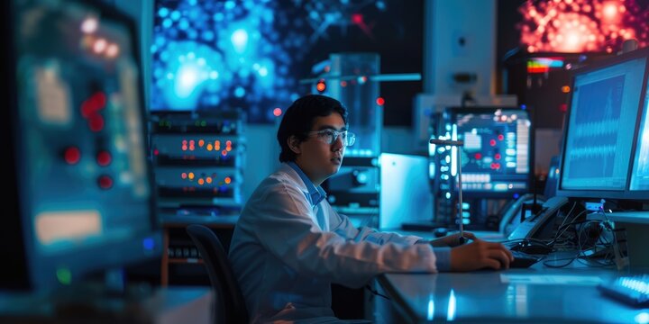 Cybersecurity professional monitors data streams and network security amid high-tech screens and equipment. AIG58