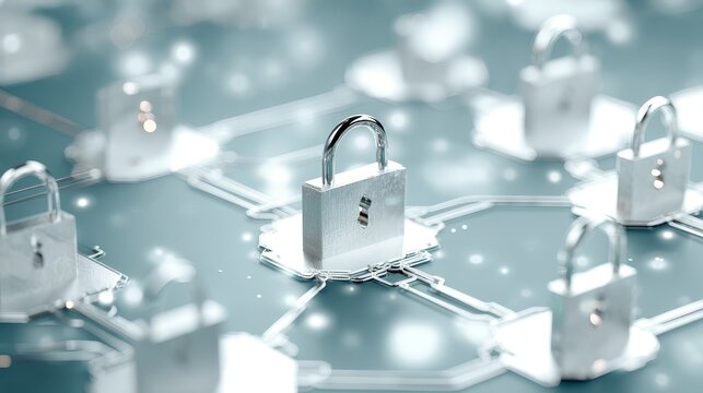 Enhanced security, lock on blue background with abstract shapes symbolizing protection