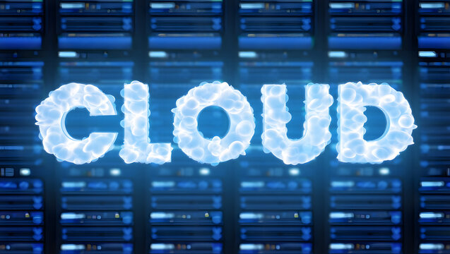 Cloud Computing: A glowing “CLOUD” script over a backdrop of server racks. It is a vivid visualization that signifies technological advancements and the digital age.