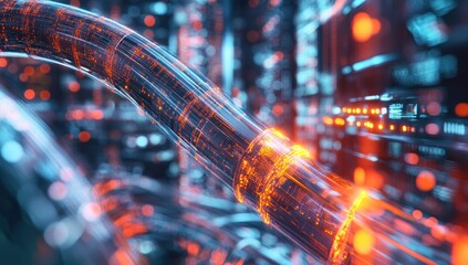 Futuristic digital data network visualization in server room