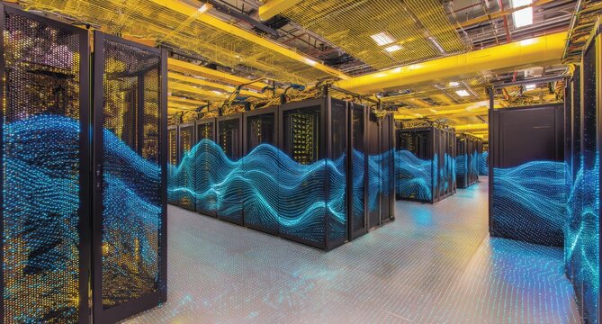 Massive server room with vibrant blue waves