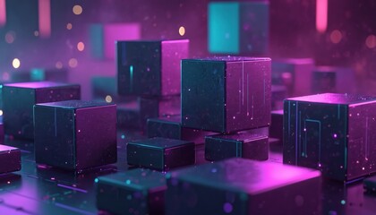 Abstract tech background with dark cubes in vibrant neon, purple, turquoise light. Modern futuristic digital design for crypto, blockchain, metaverse, AI, network tech, big data themes. Contemporary