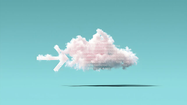A digital cloud composed of binary code floats above a flat surface against a blue background, symbolizing cloud computing or data storage.