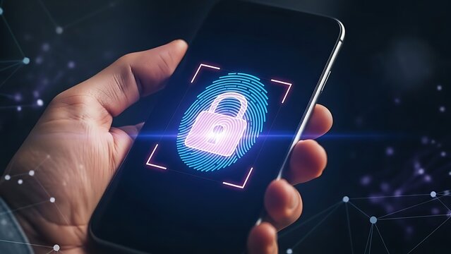 Hand holding a smartphone displaying a glowing fingerprint and padlock icon, symbolizing mobile security and biometric authentication.