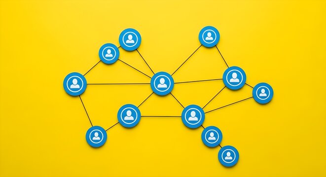A network diagram consisting of blue circles connected by thin black lines on a bright yellow background
