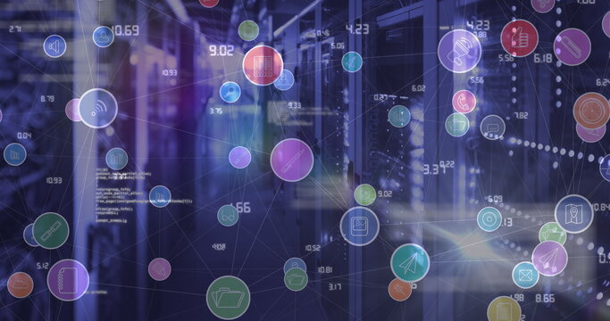 Image of digital icons and data processing over server room