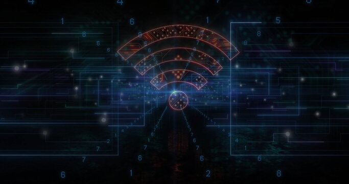 Futuristic neon wireframe car with floating numbers in digital tunnel