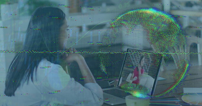 Attractive businesswoman in white shirt at workplace working with laptop to hire new employees for international business consulting. HR, social media hologram icons over office background