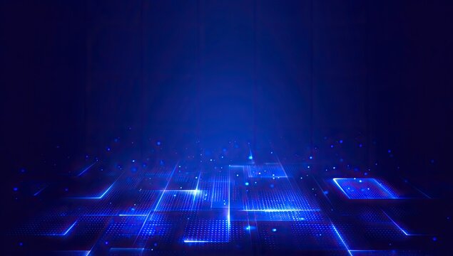 Abstract digital landscape of glowing blue cubes and dots. Dark, futuristic, tech background, 3D render
