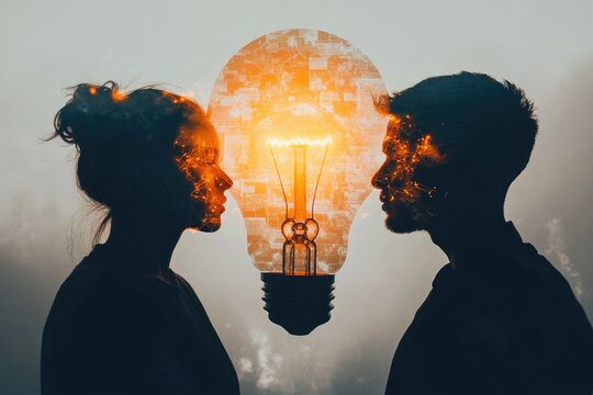 A man and woman's silhouettes face a glowing lightbulb, symbolizing collaborative innovation and bright ideas.