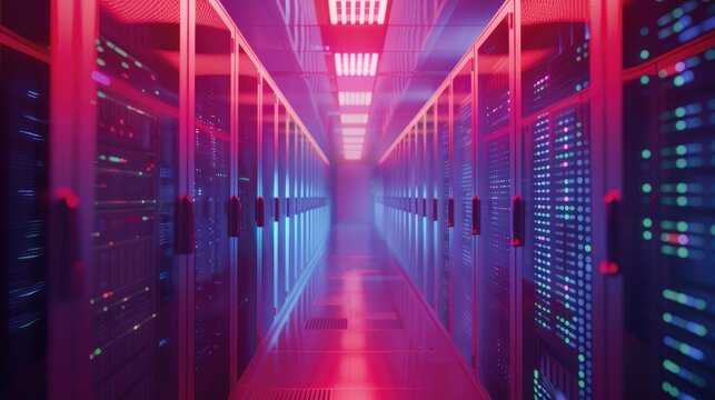 A picture of a server room with a row of servers. This image can be used to depict technology, data storage, network infrastructure, or the concept of cloud computing