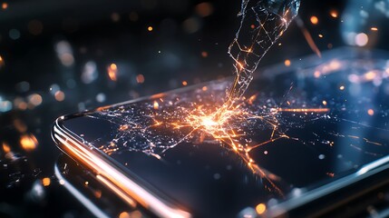 A close-up view of a smartphone immersed in glowing light particles, depicting digital connectivity and technological advancement
