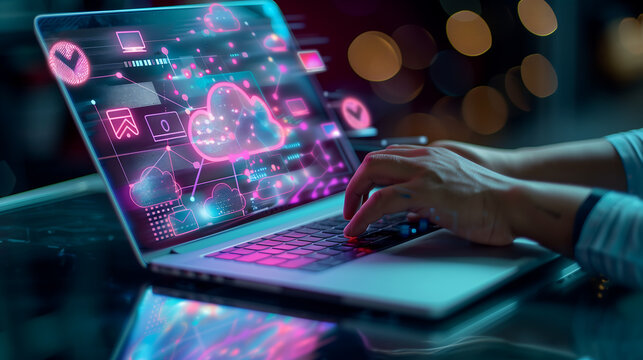 Closeup of hands typing on laptop with digital cloud icons and data flow stairs glowing in background, online storage, network technology concept