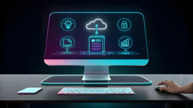 Holographic computer screen with cloud data and icons