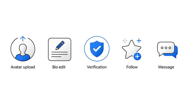 Set of user interface icons isolated on white background, avatar upload, bio edit, verification, follow, message, vector illustration