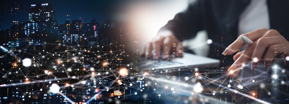Person holding tablet displaying digital network connections and social interaction concept over city skyline in the background near water body
