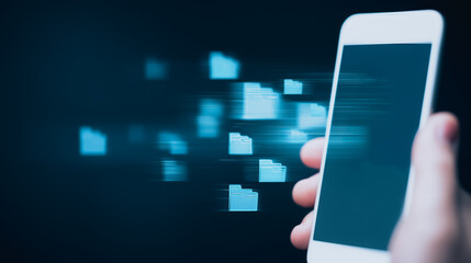 Digital Data Transfer: A close-up shot of a hand holding a modern smartphone with a blank screen, while file icons are displayed transferring through the air, symbolizing data transmission.