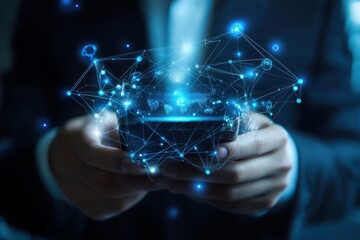 Innovative tech professional connecting global data streams through advanced digital network on smartphone