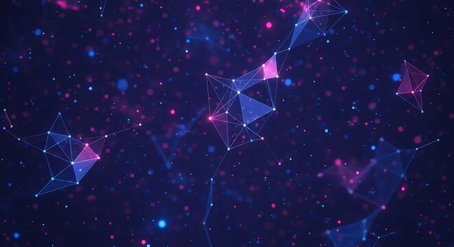Abstract network of glowing blue and pink nodes and lines against a dark cosmic background, representing data connections and digital networks
