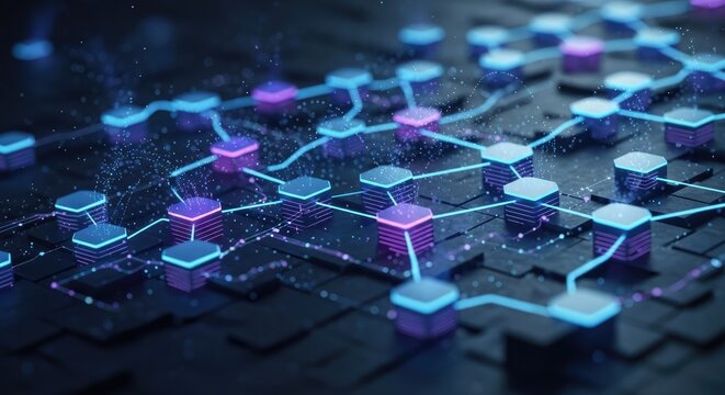 Futuristic network of glowing digital nodes and connections