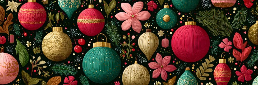 Beautiful Xmas pattern with ornaments. Christmas wrapping paper concept. Vector