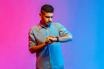 Portrait of young adult concentrated man in shirt standing looking at his smartwatch, checking time, being hurry to meeting. Indoor studio shot isolated on colorful neon light background.