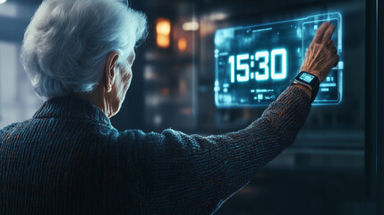 An older woman is touching a digital clock that reads 15:30. Concept of modern technology and the idea of time being a constant presence in our lives