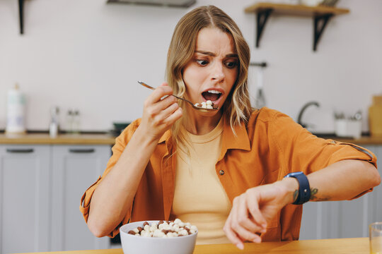 Close up young shocked sad housewife woman she wear orange shirt casual clothes look at smart watch check time being late sit at table in light kitchen at home alone. Lifestyle cooking food concept.