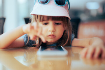 Little child playing on a Smartphone engaged in online entertainment time. Girl spending too much screen time being absorbed by endless internet fun