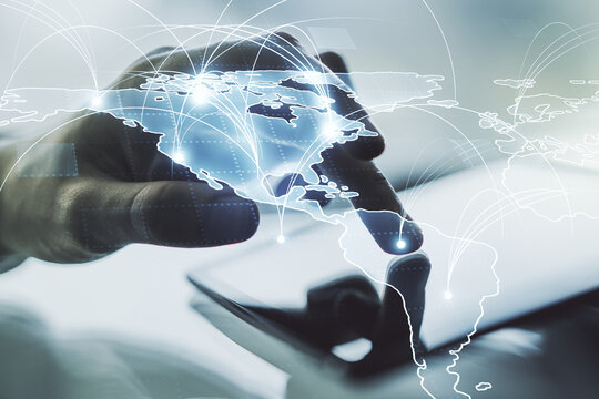 Digital America map and hands typing on computer keyboard on background, global technology concept. Multiexposure