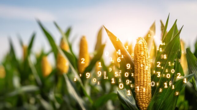 Golden corn field stretching to the horizon under a bright sun with digital numbers and data graphics overlaid on the crops symbolizing modern agriculture smart farming and agritech concepts.