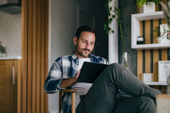 A serious-looking man spending time indoors, at home, using modern technology.