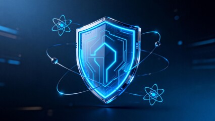 Glowing holographic shield 2026 emitting neon cyan orbital ring with digital flares