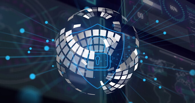 Glowing padlock icon pulsing in digital dashboard with location pin, gauge, graphs and overlays