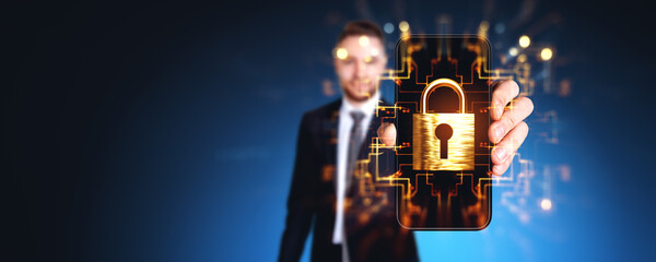 Businessman showing phone with golden padlock hologram and circuit. Copy space. Ai generative