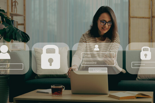 Privacy protection. Woman using smartphone and laptop at home. Digital login interface and illustration of padlock
