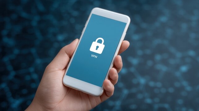 Hand holding smartphone displaying VPN app interface with padlock symbol against a blue abstract background representing data protection and privacy online