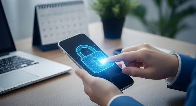 Illustration of person using smartphone with glowing digital padlock icon on screen, symbolizing mobile security, data protection, and authentication concept