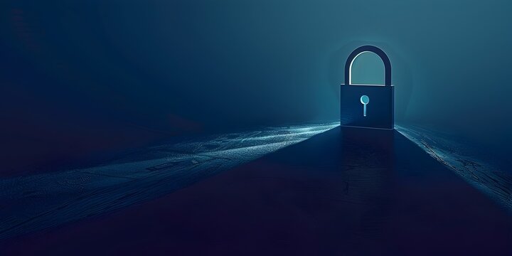 A glowing blue padlock sits at the center of a hexagonal grid, representing digital security and data protection within a futuristic, technological landscape.  Bright light emanates from the backgroun